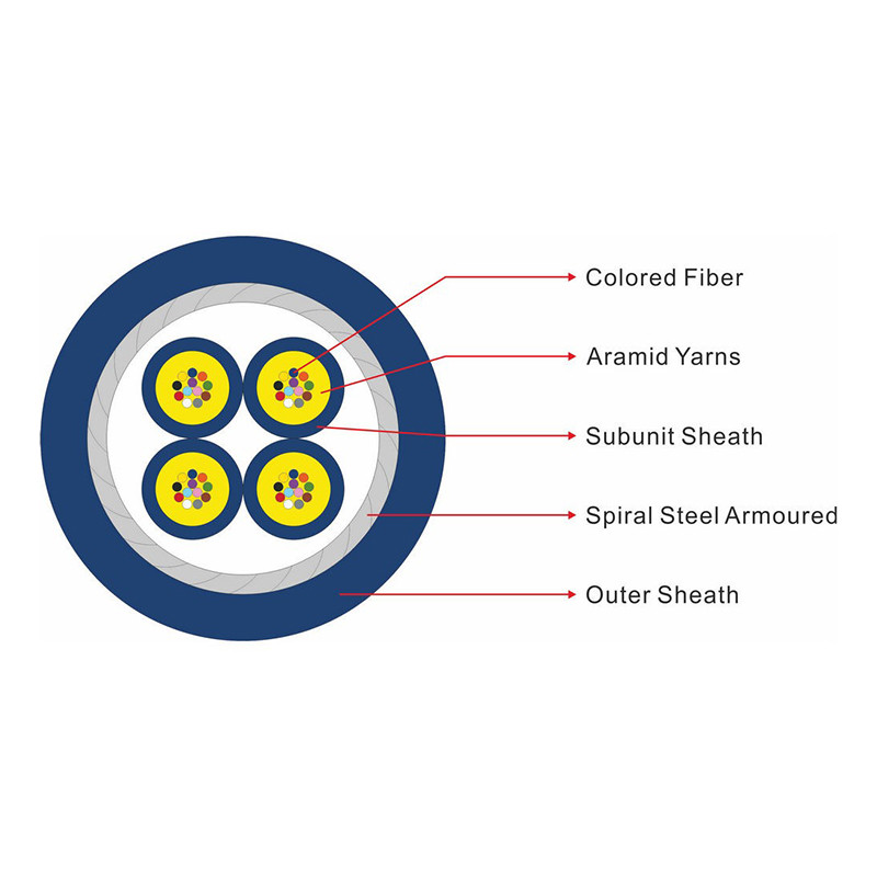 GJASFKV Indoor Multi-Core gepanzerte Glasfaserkabel ist die mehrstrangige Aramidfaser mit einer Multi-Core-Bundle Mini ф250μm Glasfaseroberfläche verstärkt.Eine PVC- oder LSZH-Innenjacke wird als Untereinheit auf der Strangoberfläche extrudiert, und die Mehrkern-Bündel-Untereinheit wird in einen Kreis verdreht. In der äußeren Schicht, die eine Schicht aus Stahldraht-Rüstung wickelt, wird eine kleine Menge Aramid auf die Stahldraht-Rüstung aufgetragen.mit einer Breite von mehr als 20 mm,.